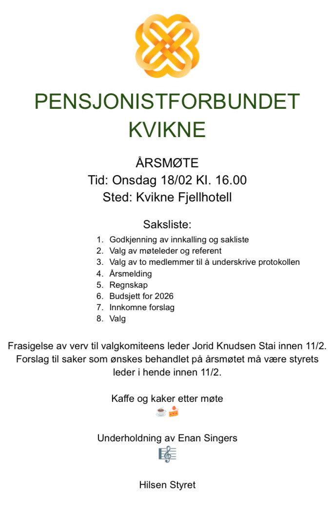 Årsmøte Pensjonist-forbundet Kvikne