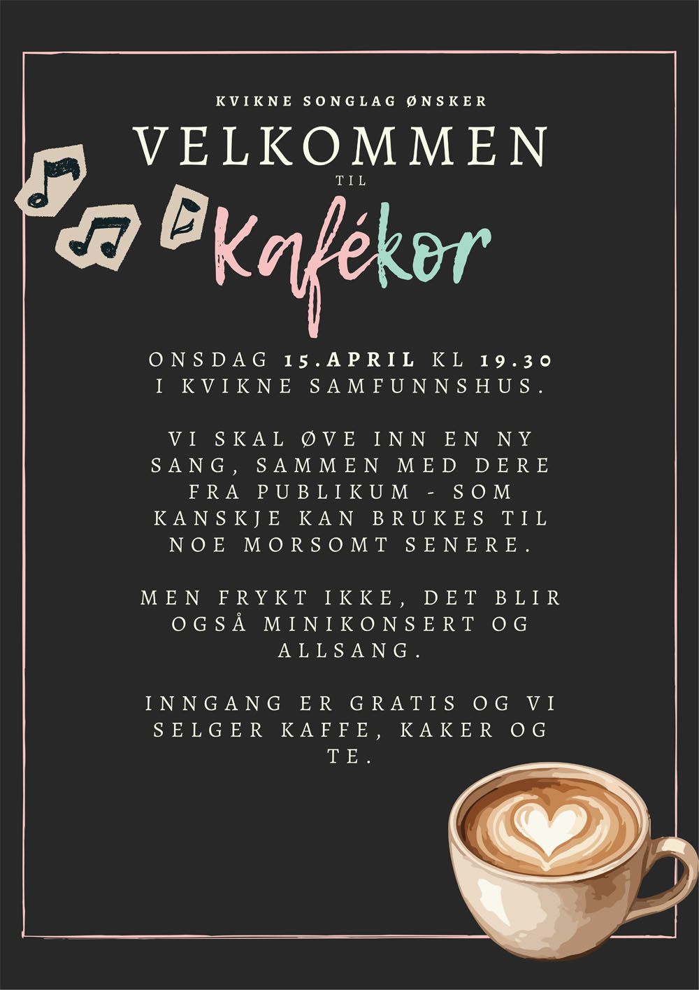 Kvikne Songlag har vært så heldige og få midler for prosjektet «Hele bygda synger». Vi vil derfor invitere alle «bygdas beboere» til Kafékor, hvor vi skal synge litt sammen, blant annet en nyinnøving som kanskje kan brukes senere.